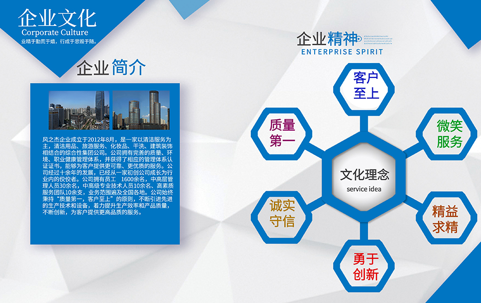 公司是一家以清潔服務為主,旅游,干洗、化妝品、裝修和餐飲相結合的多元化發(fā)展運營的服務性企業(yè)。企業(yè)本著誠信第一、服務至上的原則,依靠公司盡我所能、力我所及的信條從2012年到現在服務了多家企業(yè),現在我們已經擁有了400家左右的清潔服務項目和多家洗衣店。我們會一直牢記服務,創(chuàng)新才是我們企業(yè)發(fā)展的服務宗旨。